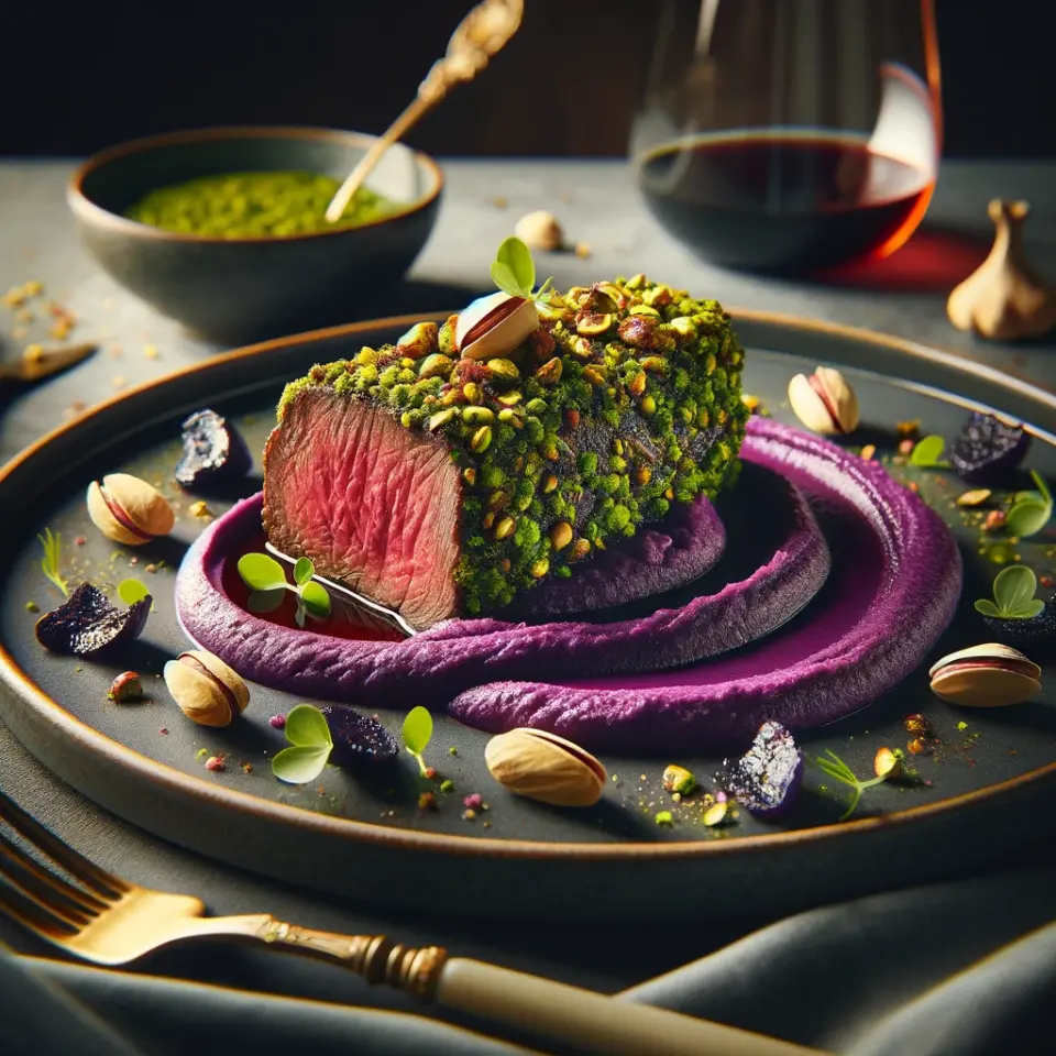 Filetto di Manzo in Crosta di Pistacchi con Purea di Patate Viola